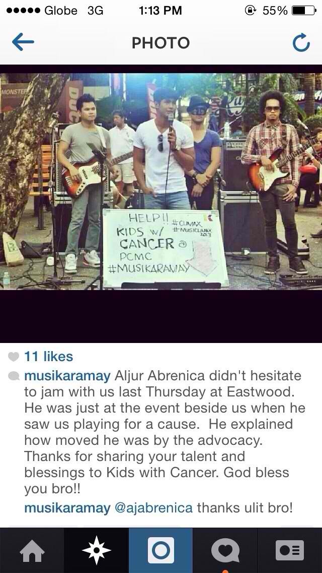 Below that photo was this caption: “Aljur Abrenica didn’t hesitate to jam with us last Thursday at Eastwood. He was just at the event beside us when he saw us playing for a cause. He explained how moved he was by the advocacy. Thanks for sharing your talent and time to kids with cancer. God bless you, bro!” At their official Facebook account, Musikaramay organizers described Aljur as “unselfish, accommodating, and very down to earth.”