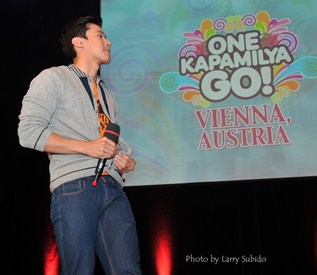 OKGo! goes to Vienna. Kicking off the parade of events is the first ever OK Go! in Vienna staged by the premier Filipino network last June 1 in partnership with ABS-CBN’s Regional Network Group. Steering the event into a colorful mix of musical performances, Pinoy goodies and movies were teleserye stars Piolo Pascual and Angelica Panganiban and dance icons Maja Salvador and Enchong Dee plus comedian Pooh. The event held at the Austria Center Vienna was filled to the brim by 3,000 Filipinos and featured a special screening of “Starting Over Again” starring Pascual and Toni Gonzaga. As early as 10 a.m. Filipinos lined up, reaching the train station which was several meters away from the venue. Tulong Na, Tabang Na, Tayo Na shirts were also sold to continue supporting the survivors of Typhoon Yolanda (international name Haiayan).