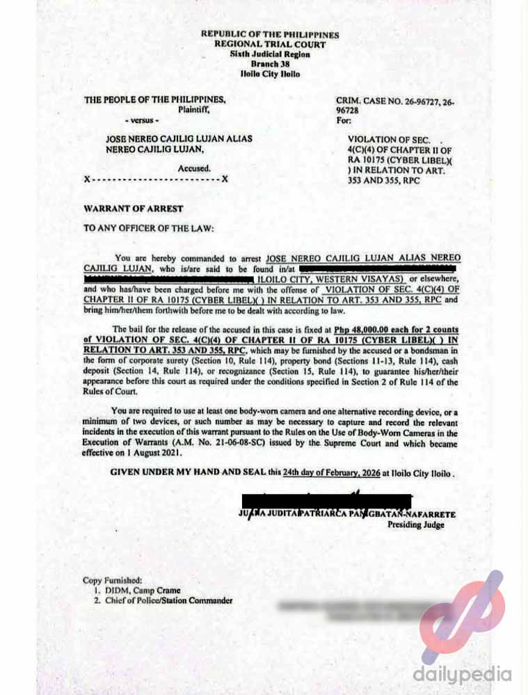 Judge Judita Patriarca Nafarrete of the Iloilo City Regional Trial Court Branch 38 issued a warrant of arrest against Jose Nereo Lujan, a member of the Executive Council of the NCCA National Committee on Monuments and Sites (NCMS) and the concurrent head of the Public Information and Community Affairs Office (PICAO) of the Iloilo Provincial Government.